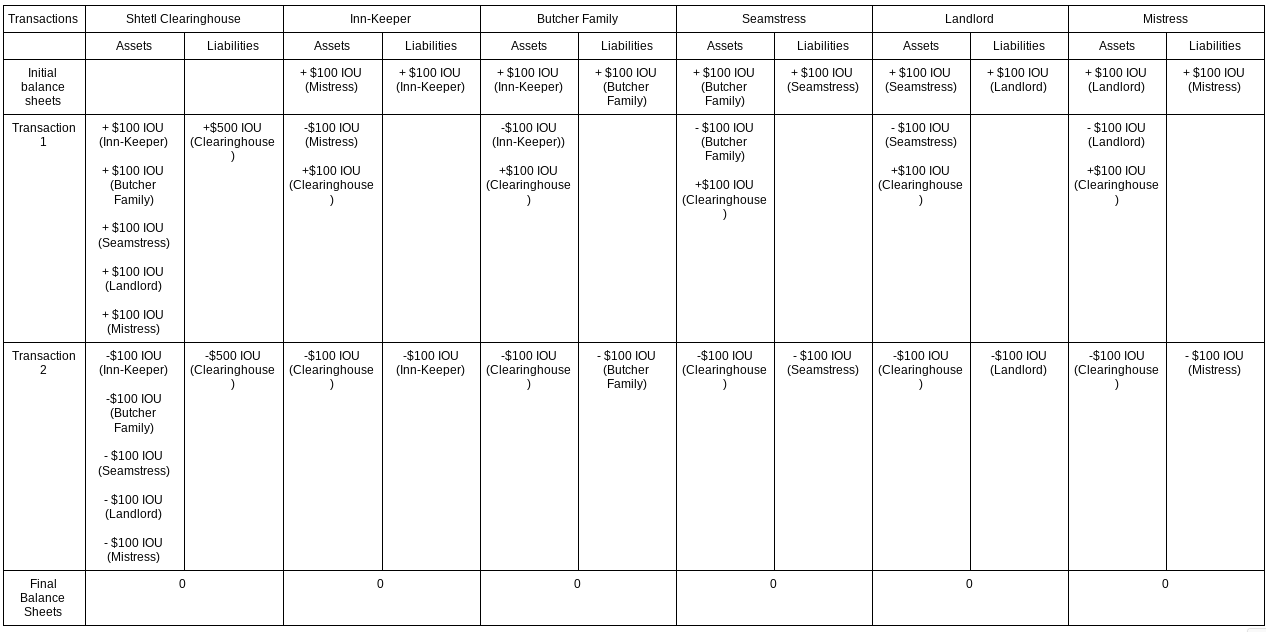 What the shtetl needs is to increase the “moneyness” of their IOUs by gaining the legal right to settle payments with them. The problem with the current system is it is a set of bilateral (two way) debts with limited transferability and usage possibilities for each IOU. In other words, the payment system in this little town is diffuse, fragmented and unreliable. Of course, this type of system isn’t simply a free ride. In small communities with bilateral, informal payments you can be sure to be ridiculed if you don’t return the favor. The trouble is that these enforcement mechanisms are grounded in local knowledge and have very little in the way of formal third party enforcement or use beyond the local area. If money is indeed “what a payment system does” then making IOUs more widely acceptable, more easily transferred and payment processing faster is in a very literal sense improving and streamlining money itself. Next week we’ll expand our purview to banks, but for today we’re going to start with an entity called a “clearinghouse”.