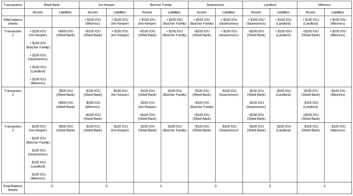 The second thing you’ll notice when you look at this set of transactions closely is that this process of netting out of debts doesn’t particularly require a clearinghouse. All you need is an entity which buys additional IOUs from every individual. In turn, each member of the shtetl could use the proceeds of selling IOUs to that entity to pay off their debt to other members of the shtetl. We actually have an entity that does that in our society today- its called a bank. The most basic feature of banking involves the bank creating its own IOU which it swaps for the IOU of households or businesses. This is clearest when we use the example of U.S. banks before the Civil War which simply emitted their own unique banknotes. Hence the phrase “banknote”; they were literally the notes of banks!