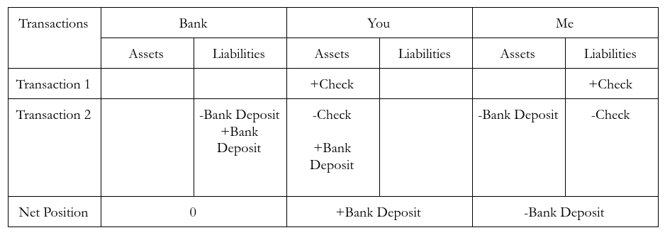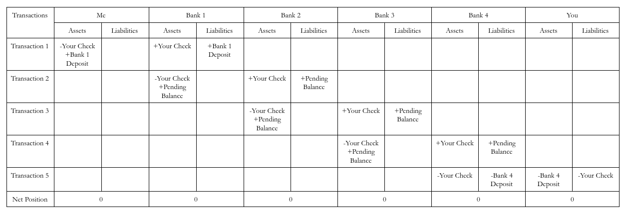 These agreements usually involved a correspondent bank not only accepting their own checks at no cost, but also the checks of banks within short geographic distances. Yet, these banks may not actually have clearing relationships with those banks. In that case, they sent the checks to another bank which agrees to accept those bank’s checks in payment. The hope is that, eventually, the checks make it back to the original bank and successfully clears. This is a time-consuming and cumbersome process which partially motivated the formation of the Federal Reserve. To fully grasp just how time consuming and cumbersome this process is, I’ve written out a very large T account where a check has to work its way through 4 banks in order to be processed. There are stories of checks requiring 11 banks and 11 days to be processed. Imagine you sent me a check and I went to my local bank to deposit it.