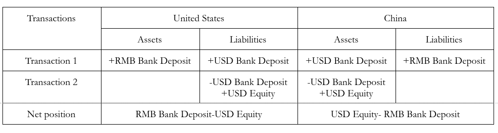 In transaction 1, the U.S. Bank now holds a Renminbi bank deposit and thus is a creditor of a Chinese bank. Meanwhile the U.S. Bank is now a debtor to a Chinese resident. The second transaction simply involves the Chinese resident purchasing a stock on the New York Stock Exchange. The final net position comes down to the United States owning a Renminbi bank deposit and “owing” a NYSE listed stock “to China”. The flipside of that is that “China” owes a Renminbi bank deposit and owns a NYSE listed stock.