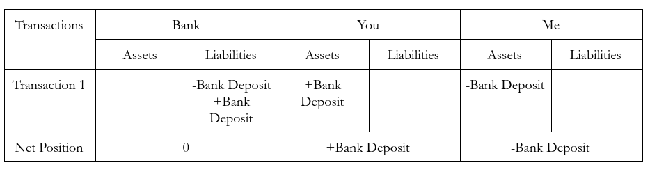In our personal lives, it’s obvious that money in this circumstance is flowing away from me and towards you. Yet, in the balance of payments, this is seen differently. Imagine that the bank in this circumstance and myself were one country and you were your own country. To simplify things, I’m going to exclude intra-country transactions. When you do that, this set of transactions simplifies to the emission of a bank deposit from Country A to Country B.