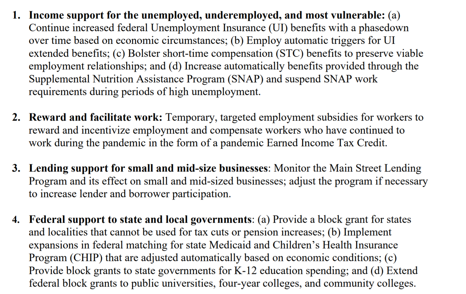 This perspective clearly guides their 1st, 5th and 6th proposal in their 10 point plan. Their first proposal is to phase out the $600 dollar per week supplementary federal unemployment insurance benefit in favor of higher “replacement rates” in order to incentivize working: