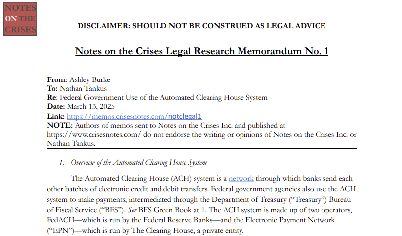 Which brings me back to ACH. Given the complexity, and relative obscurity, of this area of law and the immense amount of reporting and research I already had to do for this story, I decided to commission a full length legal memo- similar to the legal memos a staff attorney at a financial regulatory agency or white shoe law firm might produce- on the “Federal Government Use of the Automated Clearing House System”. The attorney I commissioned, Ashley Burke, did an excellent job and I have uploaded “Notes on the Crises Legal Memorandum No. 1” to my website to make it widely available and free to anyone who is in need of detailed legal analysis in this suddenly crucial area of law. Ashley is, of course, not responsible for any of the claims I make in this article and can’t attest to the accuracy or reliability of my reporting. Nor can her memo be construed as legal advice.