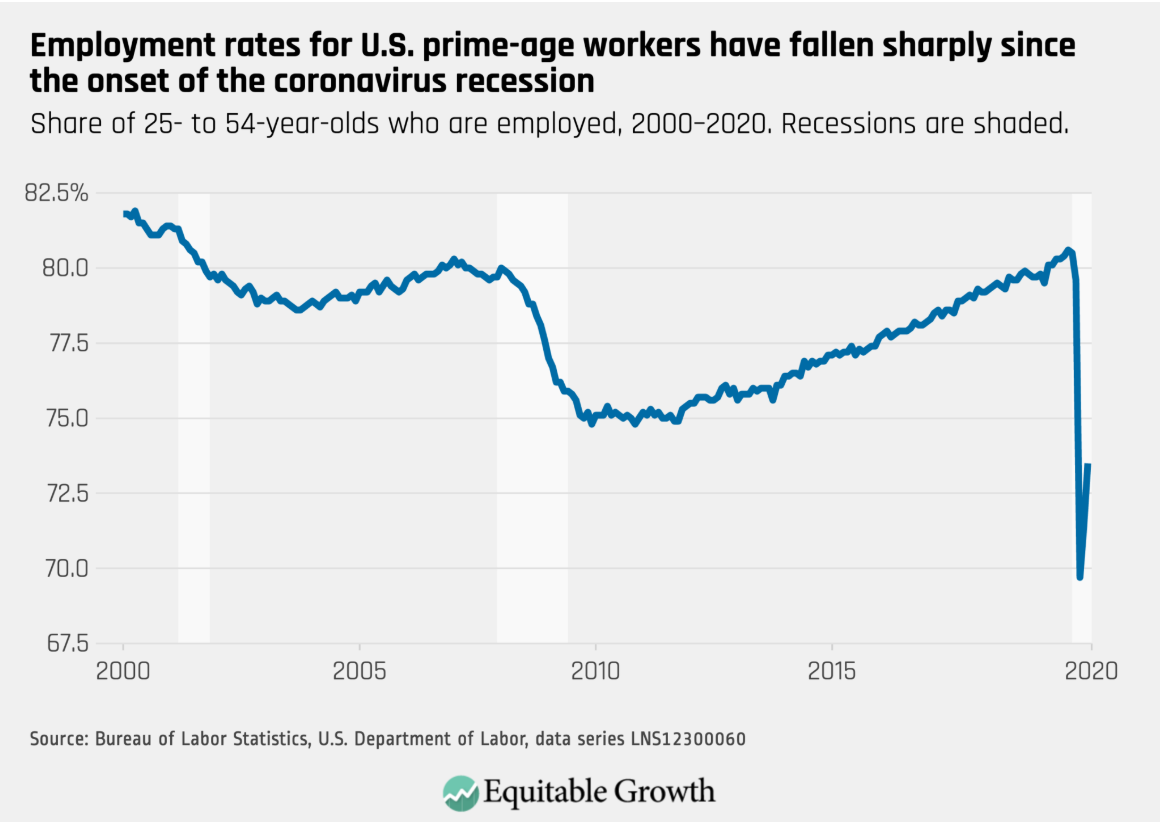 To start with, look at this graph of prime age employment rates provided by Kate Bahn and Austin Clemens at the Washington Center for Equitable Growth.