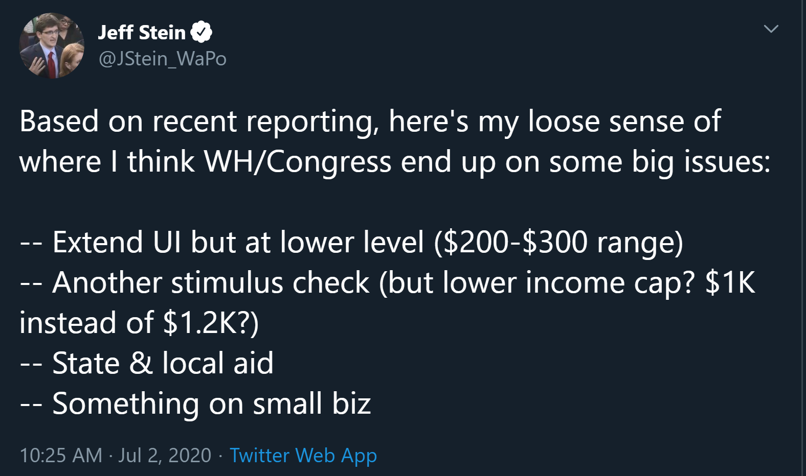 Whether congress will is in grave and dangerous doubt. The 600 dollar a week of federal supplementary benefits are in danger as it comes under attack for specious relative price arguments which I wrote about two weeks ago. The alternatives the Aspen Institute institute economists suggested are not administratively workable, at least not in time for August, so in practice “incentive to work” arguments will result in simply cutting the supplementary benefits arbitrarily all together. This is consistent with the reporting the Washington Post’s Jeff Stein has been producing: