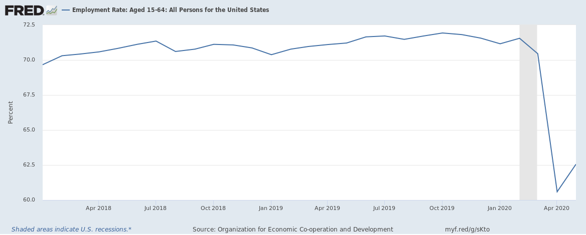 While this is a graph of what the Bureau of Labor Statistics calls “prime-age workers”, those workers who are 25 to 54, these patterns are reproduced across all sorts of different measures of the labor market. The scale of the drop as well as the “bounce” is clearer in the Federal Reserve Economic Data (FRED) graph run by the Federal Reserve Bank of St. Louis, though it has not yet been updated with June data. I’m using the 15-64 year measure calculated by the Organisation for Economic Co-operation and Development, which shows that there is a similar (and appalling) 10% drop in labor force participation from the Coronavirus Depression.