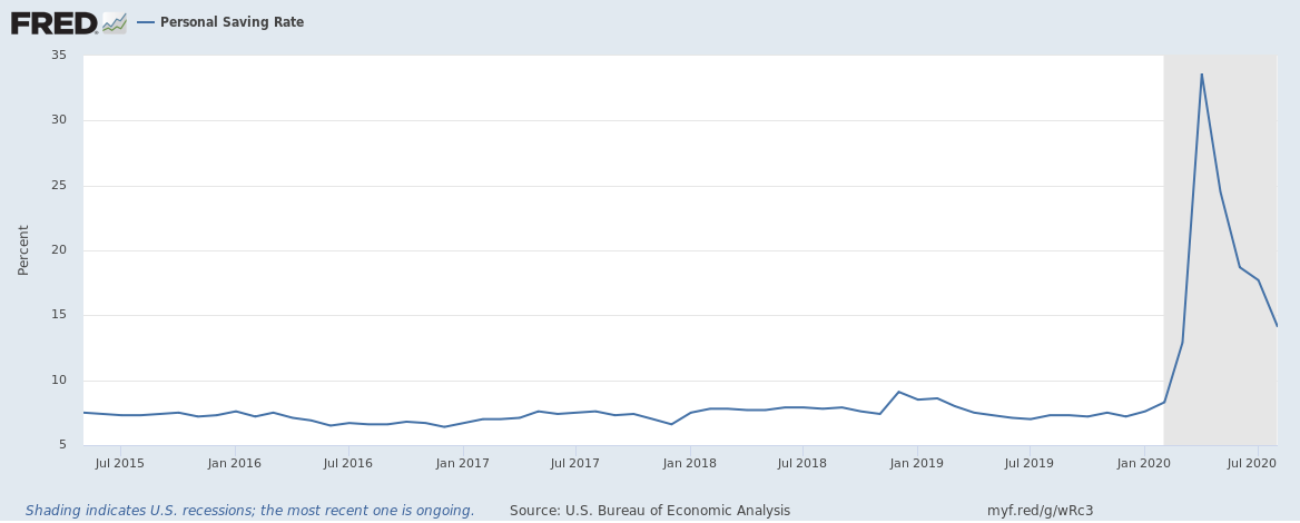 A similar story is told in the aggregate data. The saving rate peak coincided with the beginning of the stimulus check payments and supplemental unemployment benefits. As the stimulus checks were exhausted, the saving rate fell. It’s not possible to get a complete picture yet: we don’t have data for September, which will likely show larger declines. With the emergency FEMA payments declining, the desperation that has already racked millions of families is spreading — and so is the virus.