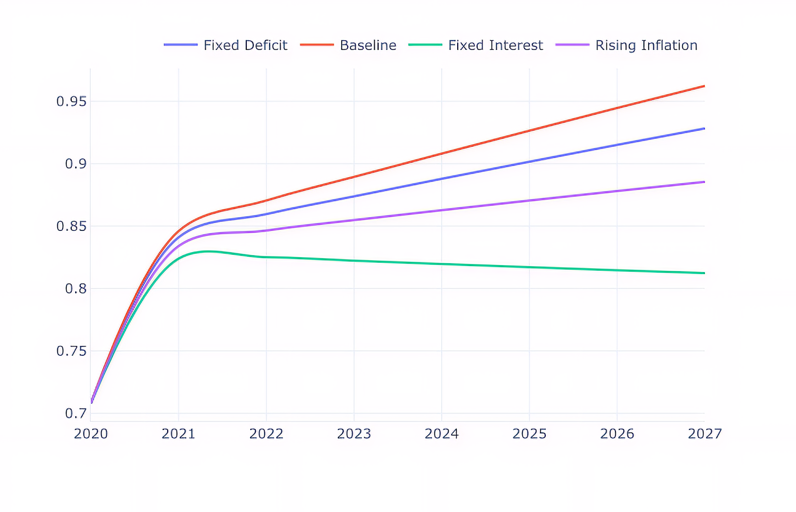 - The Baseline scenario shows how debt would change if all variables remain in the same range as they were in 2020.