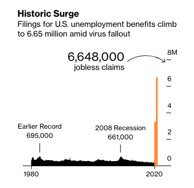 The unemployment claims announced today is double what it was last week, which was a staggeringly large number already. The two weeks combined is a little over 3% of the entire U.S. population. The great recession is barely a blip when compared to the size and the speed at which this depression has happened. As I said almost 2 weeks ago: