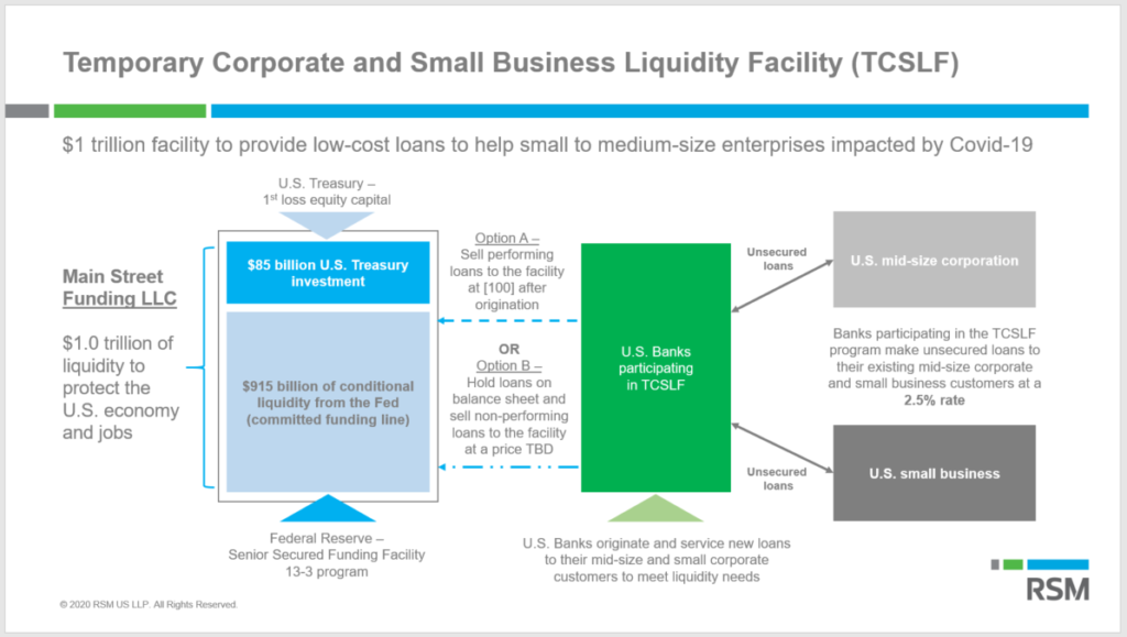 “Two provisions within the CARES Act would encourage the Federal Reserve to stand up such a program. One provision instructs the Treasury Secretary, with the Federal Reserve, to create a facility where banks and other lenders would receive financing to lend to mid-sized businesses. The law defines eligible businesses as those having between 500 and 10,000 employees, and also includes nonprofit organizations. The suggested program would cap the annual interest rate on loans at two percent, and the Treasury Secretary could provide forbearance on loan payments for six months or longer.