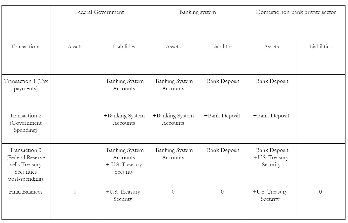 What is remarkable is that this set of transactions, from the consolidated point of view, is almost identical to the set of consolidated transactions above. The consolidated government creates money which the private sector receives, and then it sells negotiable securities to drain money right back out. All that is different is that it is the Federal Reserve issuing securities now, not the U.S. Treasury. This would be legally important- it would put the debt ceiling fights in the past once and for all- but it wouldn’t make MMT’s claim that the Federal Government, as a whole, finances its spending with money creation any more true. Instead, what it would do is give the Federal Reserve more control over the maturity of the government securities which are outstanding and clarify to the public that, for the Federal Government as a whole, government securities are a monetary policy tool not a financing tool.