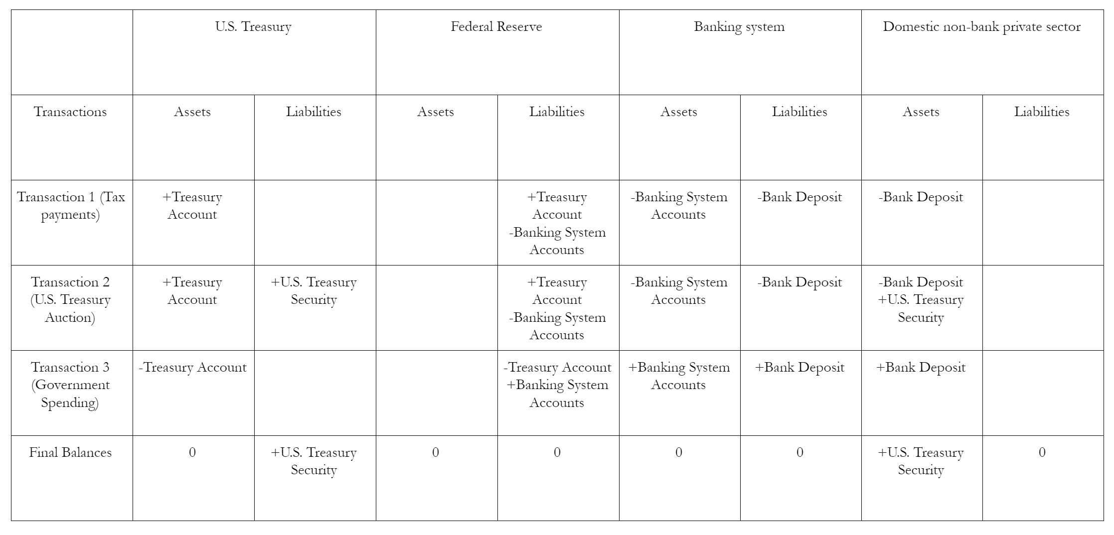Before we get into the details of financial transactions, it's important to clarify some basic points about… well… the U.S. Constitution. There are three Branches of government: Congress (the legislative branch), the Presidency (the executive branch) and courts (the judicial branch). Administrative agencies, like the U.S. Treasury, are housed in the executive branch but how they function is often structured and directed by congress (while some are just creations of Executive power). Congress also often delegates some of its powers to administrative agencies. For all sorts of purposes (both within economics and outside of it) the three branches of government are consolidated. For the purpose of calculating the U.S. government deficit, most elements of the three branches of government are consolidated. Some people might find this basic overview of the constitution strange and far afield from the monetary question under discussion, but it is not. For monetary questions in the modern United States often revolve around the Federal Reserve and we must clarify the place of the Federal Reserve in the Federal Government in order to decide what entities are appropriate to consolidate together and what entities are not. The Sterility of many debates over MMT’s controversial proposition stem from not clarifying these fundamental legal questions from the beginning, leading people to talk past each other.