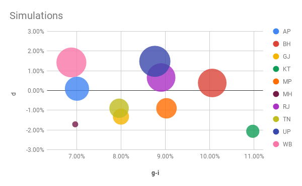 Chart 1 shows the simulated value of the constant level of new borrowing/lending each state will have to undertake to go from their current debt ratio to 20% over the next five years. This is plotted against their average (i-g). The size of the bubbles is relative to the size of their debt ratio. A very clear pattern emerges — states with smaller debt ratios can continue to borrow more (indicated by negative d), while states with larger debt ratios will have to cut spending. This is not all. The states which can spend more are also the more prosperous states, with stronger institutions. By contrast, the states which will have to undertake austerity, are the ones which are less prosperous, not well governed, and fare badly in terms of most socio-economic indicators.