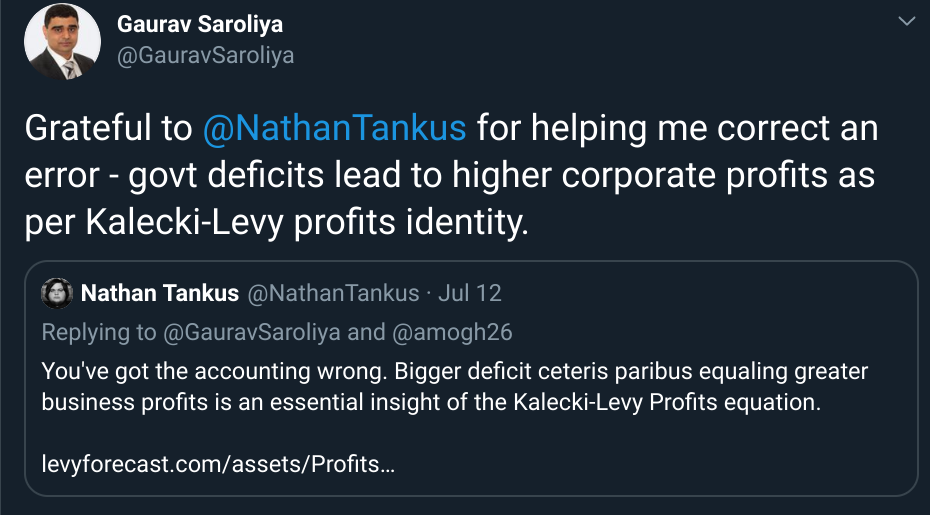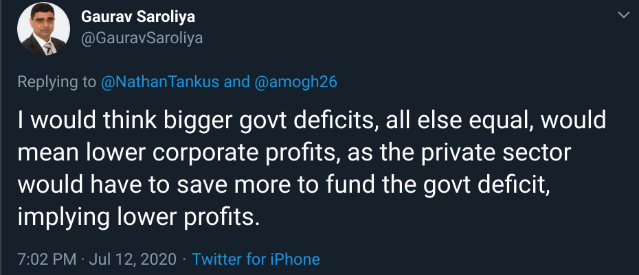 Periodically, an interaction on Twitter reminds me that it is worthwhile to make implicit knowledge among my colleagues explicit. There are important points which are well established among the economic policy analysts I regularly speak to which still need articulating to the new, much wider, audience that I now have. A couple weeks ago, that reminder came in the form of a twitter interaction with Gaurav Saroliya, the Director of Global Macro Strategy for the large economics forecaster “Oxford Economics”. In reply to another tweet by me, Gaurav argued that government budget deficits had the potential to lower corporate profits. They would achieve this outcome by requiring households to save more, thus presumably lowering household spending, and thus profits.