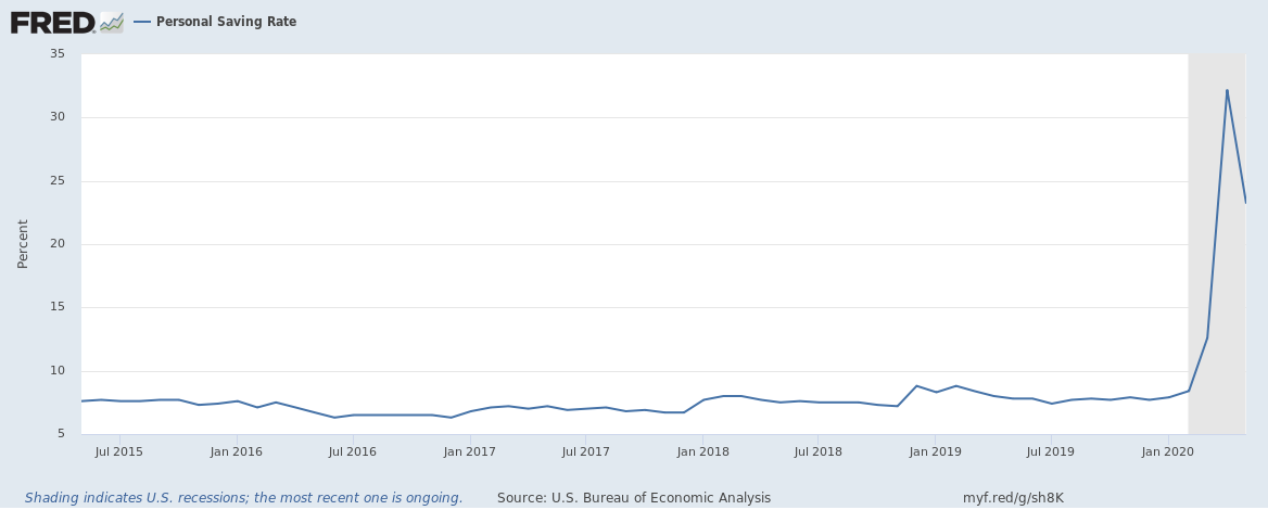 It’s important to emphasize this last point: if all other things were equal, a budget deficit would simply increase profits and household saving would reduce them. But not everything is equal and with macroeconomic accounting, you can’t hold one sector’s financial position constant.. Sometimes shifts happen between non-business sectors that leave profits untouched all together. The stimulus checks along with the supplementary unemployment benefits provide a good example of this. These cash payments weren’t immediately spent by households in the month they were received, which led to a big jump in the personal saving rate. Increasing government budget deficits straightforwardly increased household saving, without any effect on business profits.