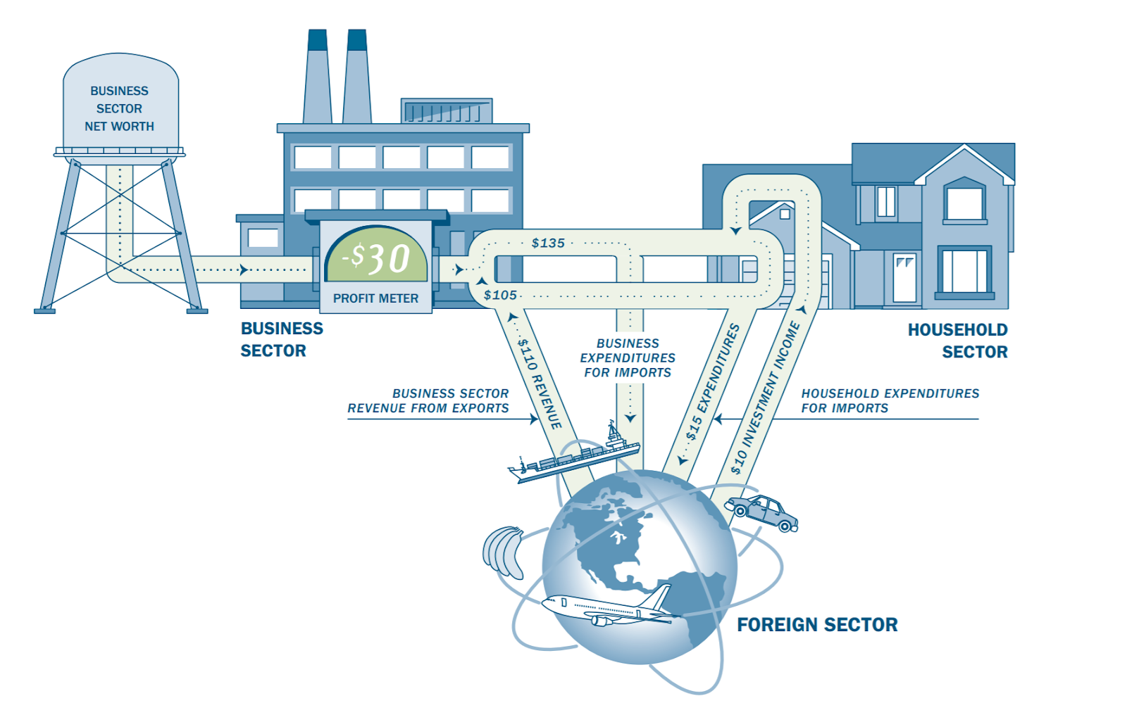Still, sometimes I regret that people learn about this (or John Maynard Keynes’s similar accounting relation investment=saving) before learning other elements of macroeconomic accounting. Investment expenditures only increase the net-worth of the private sector because the investment goods being created or purchased have monetary value. Put simply: the financial net-worth of the private sector doesn’t change because of private investment. It seems to me that explaining aggregate financial profits would be a more important starting point. In other words, identifying flows that can increase the business’s sector’s financial net-worth. This would allow us to disentangle learning macroeconomics, from learning individual business accounting.
