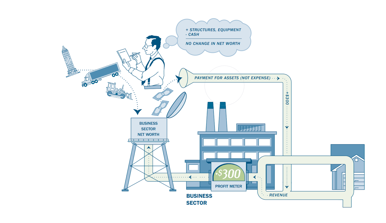 That said, the surplus being measured is not a purely financial surplus. Non-financial value also counts towards aggregate profits. This holds because, well, it counts towards individual company profits. Investment Expenditures are not equivalent to firms shedding profits. A company that spends 100 dollars purchasing a machine now has a machine worth 100 dollars — those funds spent are not a loss. Over time the expenditure on that machine will be recognized as a cost, but there won’t be any associated expenditure at that time.